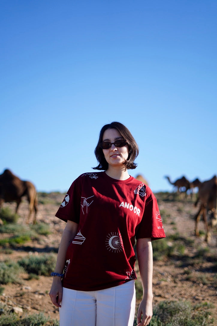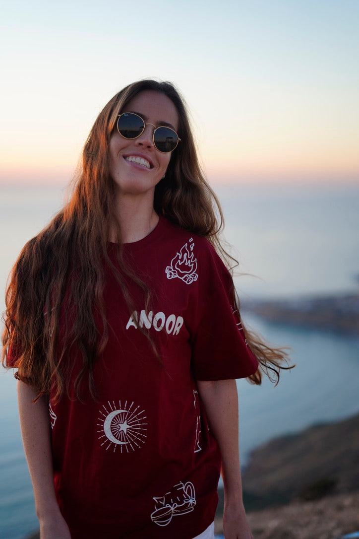 Das ANOOR Community Shirt in bordeaux rot mit weißer Bedruckung steht für Bewegung, Begegnung und Alltag zwischen Küste und Stadt.